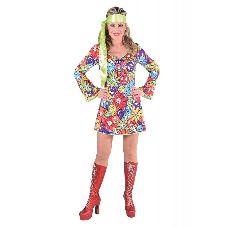 Déguisement disco femme composé d' une robe avec des motifs rétro. Ce déguisement est idéal pour le carnaval ou vos soirée déguisées. Le bandeau n' est pas compris.
